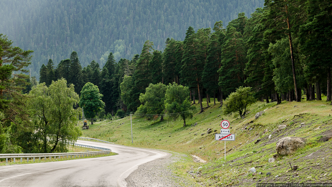 Вода хрустальной лентой падает с отвесной серой стены. Здесь любят посидеть, подышать свежестью, исходящей от разбрызгиваемой воды. Отсюда, с верхней границы леса, хорошо виден поселок Архыз, долина реки Кизгыч, в верховьях которой видна полосатая округлая каменная возвышенность Тюбетейка. Долина по форме напоминает корыто с плоским дном. Когда-то язык ледника тащил здесь вмороженные в его тело камни и «выцарапывал» себе ложе. Когда ледник растаял, камни эти остались в виде моренных валов, перегородивших долину в нескольких местах на дне котловины. Одна такая морена лежит у въезда в поселок Архыз.