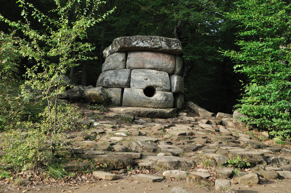 От останцев тропа идет вверх. Слева, у края холма, уцелела оборонительная стена трехметровой высоты, сложенная из плоских камней без раствора. Если подняться выше, можно различить фундаменты домов — они стояли близко друг к другу на плоском участке городища. Еще выше будет маленький дольмен (они, кстати, использовались как гробницы), у которого хорошо сохранилась передняя стенка с круглым отверстием посередине. Рядом можно отыскать несколько фрагментов дольменов. Заканчивается городище крутым обрывом, рядом с которым видны руины двух небольших церквей и несколько фундаментов домов.