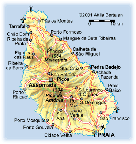 - Остров Сантьягу, на котором находится столица Республики Кабо-Верде — город Прая. Это административный центр страны, где течет размеренная деловая жизнь. Неподалеку от столицы находится первое поселение португальских колонизаторов на острове — Старый город (Сьюдад Велья), пронесший сквозь века суровую строгость построек и средневековый шарм.