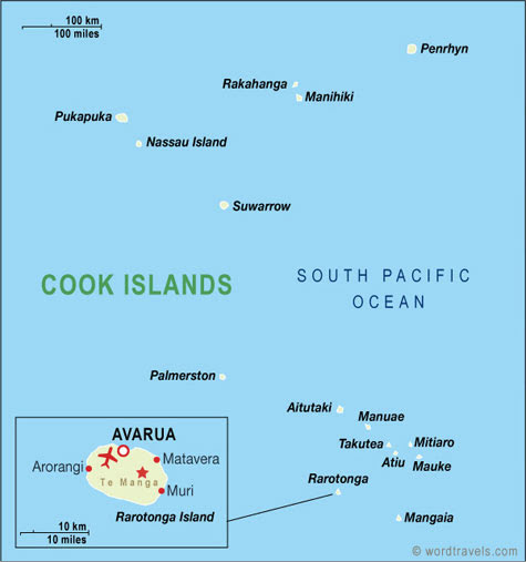 Архипелаг Кука состоит всего из 15 островов и атоллов, три из которых полностью необитаемы, общей площадью примерно 237 кв. км. Столица этой небольшой страны – Аварау находится на главном и самом большом острове — Раротонга. Там же расположены главные воздушные ворота островов Кука – аэропорт Раротонга, из которого можно улететь на другие заселенные острова архипелага.