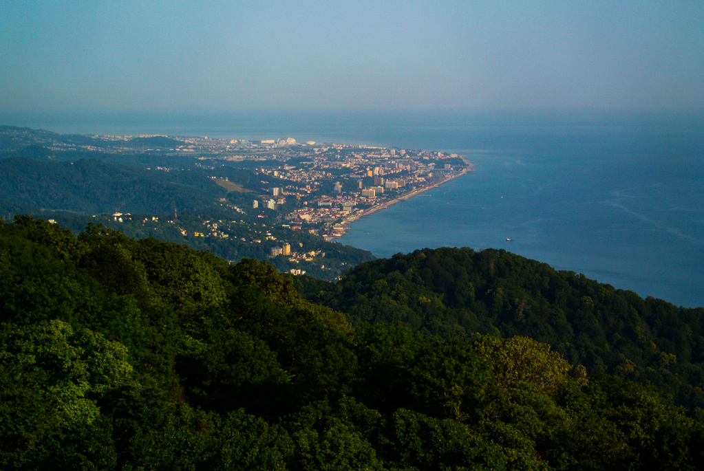 моря от Лазаревского до Пицунды. Прекрасно видны Сочи, Адлер и Имеретинская