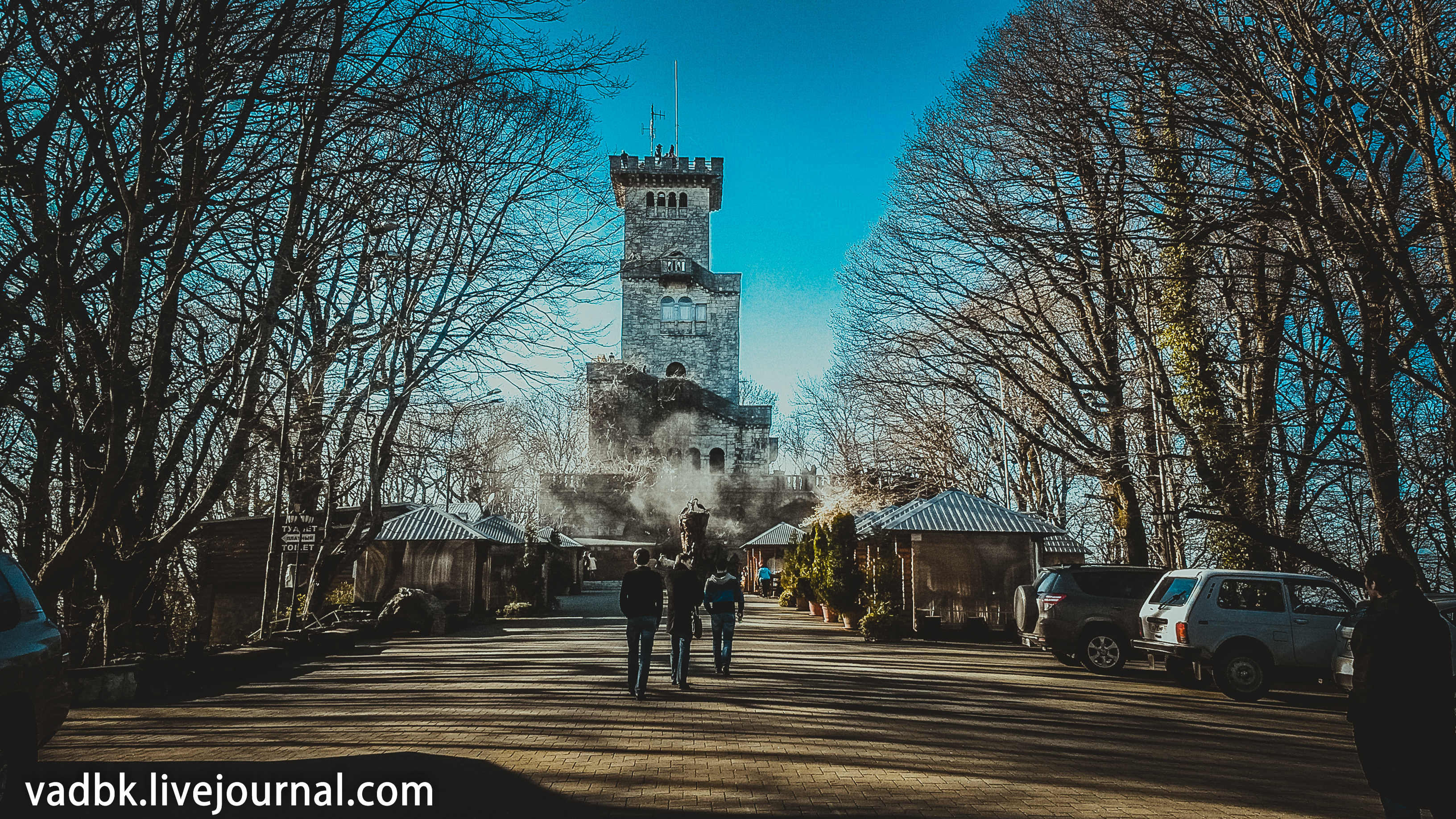 На вершине горы около башни расположена огромная парковка, вокруг которой — кафешки, сувенирные лавочки и прочие развлекаловки для туристов. Кстати, если от стоянки пойти не к башне, а в противоположную сторону, то можно дойти до руин старого ресторана с красивой ротондой на втором этаже, построенного в стиле сталинского ампира.